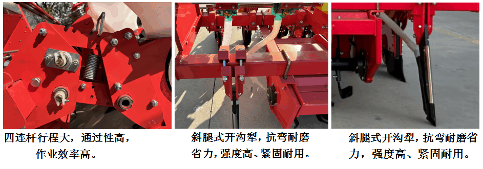 6、地輪采用單臂設(shè)計(jì),有效避免纏繞、擁堵,各行傳動軸連成一體,統(tǒng)一驅(qū)動,傳動動力大,即使其中一側(cè)地輪偶然打滑也不影響正常播種:播種單體采用仿形設(shè)計(jì),可隨地面上下浮動、可實(shí)現(xiàn)播深一致。