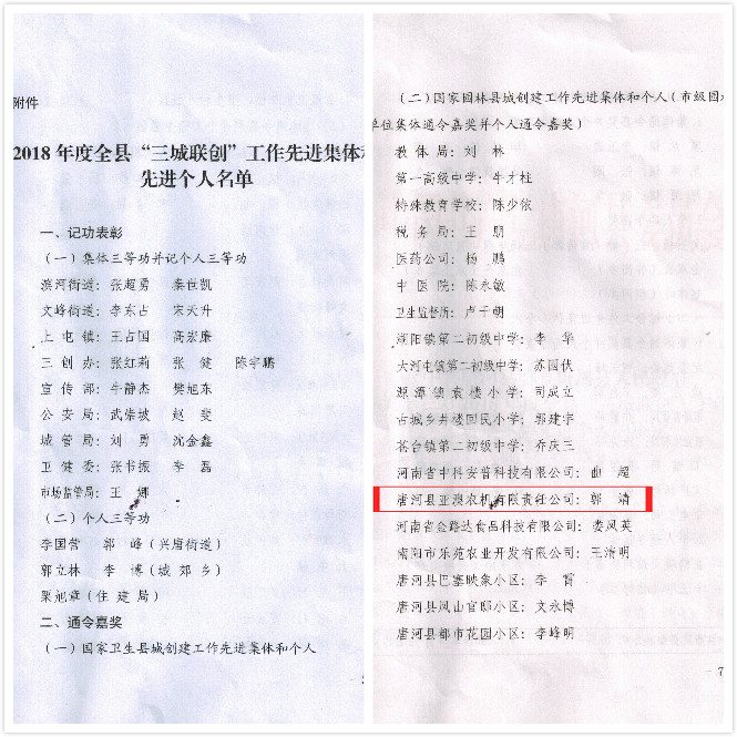 4月12日,唐河縣召開2018年度“三城聯(lián)創(chuàng)”總結(jié)大會(huì)。大會(huì)宣讀了表彰先進(jìn)集體及先進(jìn)個(gè)人的決定。亞澳農(nóng)機(jī)獲得2018年度國(guó)家園林縣城創(chuàng)建工作先進(jìn)集體。