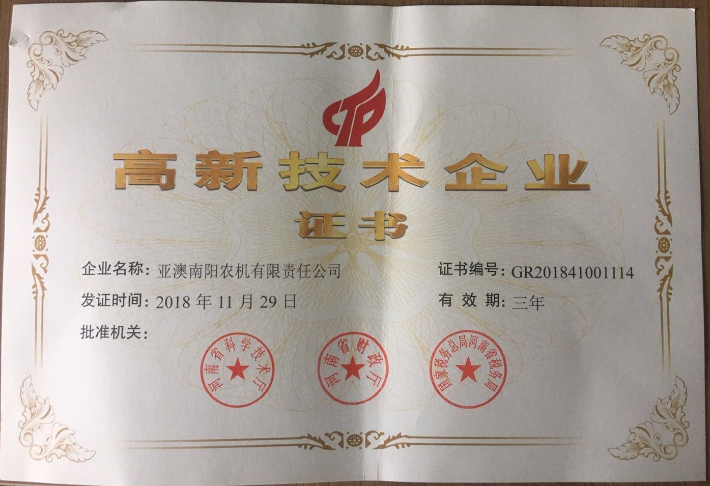 亞澳農(nóng)機(jī)喜獲高新技術(shù)企業(yè)稱號(hào)
