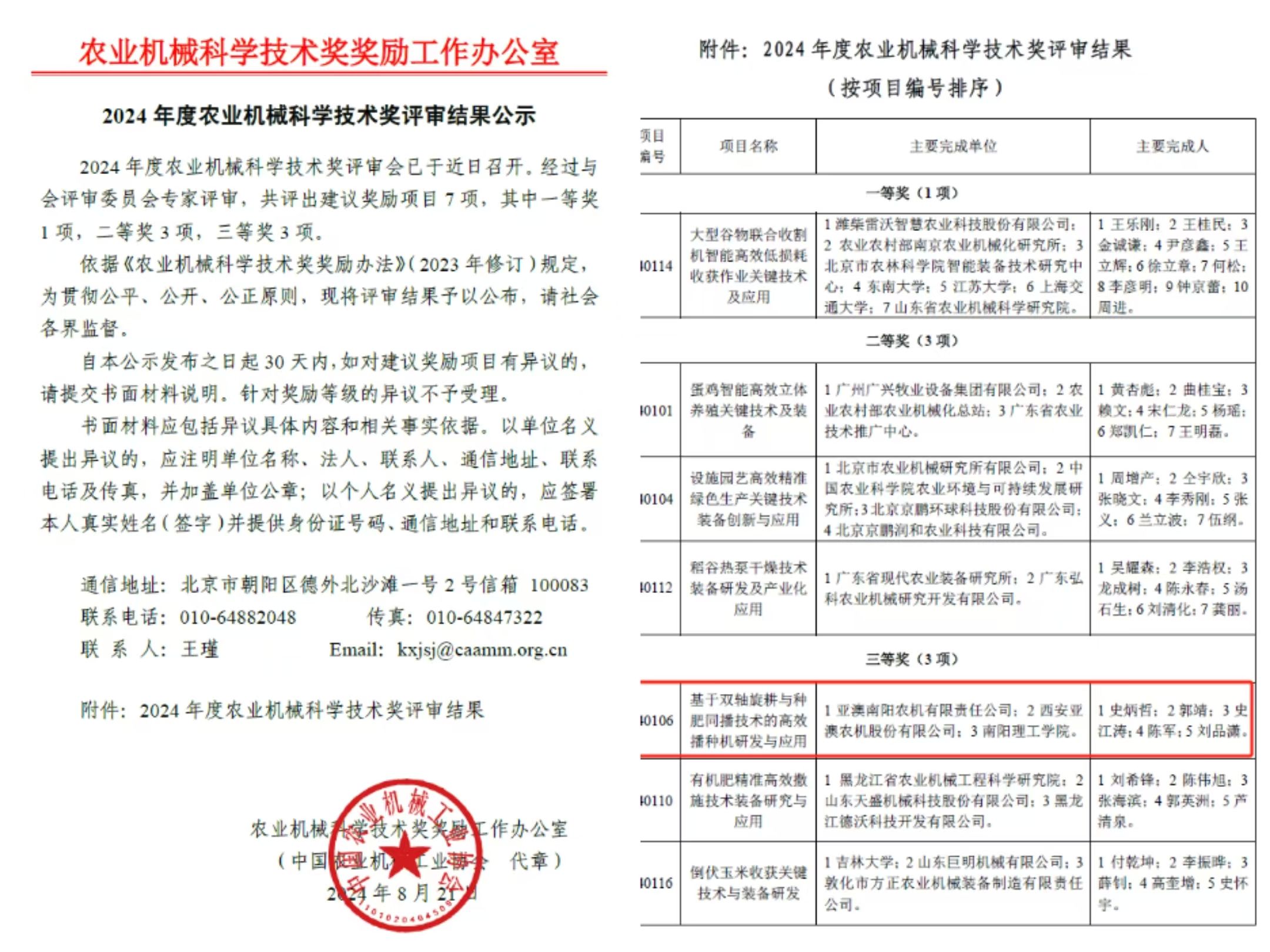 在科技與農業(yè)深度融合的時代浪潮中,一則振奮人心的喜訊傳來 ——亞澳農機成功榮獲農業(yè)機械科學技術獎!