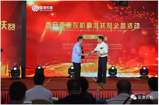 亞澳精準(zhǔn)扶貧公益活動現(xiàn)場,中國農(nóng)機化協(xié)會會長劉憲到會致辭,并給予亞澳頒發(fā)證書。