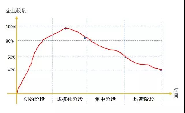 在一個行業(yè),從長期看,企業(yè)要存活下來就要有超出平均水平的成本控制能力。管理學家陳春花認為一個行業(yè)內(nèi)企業(yè)數(shù)量和時間軸之間的關(guān)系可以通過四個發(fā)展階段來說明:初創(chuàng)階段、規(guī)?;A段企業(yè)數(shù)量一直上升,規(guī)?;笃谄髽I(yè)數(shù)量達到頂峰,開始有擠出效應(yīng),約20%企業(yè)出局,到集中階段又有20%企業(yè)出局,到均衡階段還要淘汰20%,最后的競爭就在剩下的40%企業(yè)之間展開。