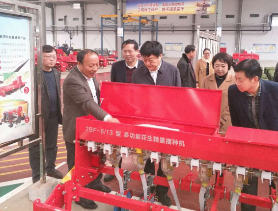 參觀過程中,劉樹華部長(zhǎng)親切的向郭總咨詢公司的產(chǎn)品,郭總向劉樹華部長(zhǎng)簡(jiǎn)述了2BF-6/13 多功能花生精量播種機(jī)的功能構(gòu)造,在得知該款機(jī)型當(dāng)年投產(chǎn)當(dāng)年熱銷后,劉部長(zhǎng)十分高興的對(duì)郭總說:“亞澳要進(jìn)一步開展科技研發(fā)工作,多培養(yǎng)、招聘科研人員,增強(qiáng)自身科研力量,成為農(nóng)機(jī)具行業(yè)的標(biāo)桿”,周天龍縣長(zhǎng)對(duì)劉樹華部長(zhǎng)說:“縣政府已批給亞澳30多畝土地,作為亞澳的科技研發(fā)中心”。